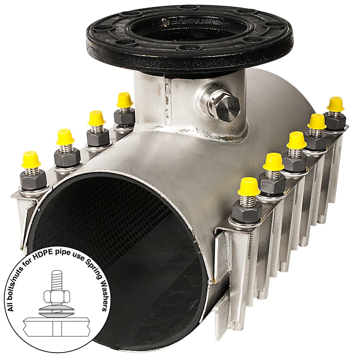 All stainless steel sewer saddle for HDPE pipe. The BP uses spring washers to help compensate for pipe contraction during temperature and pressure changes.